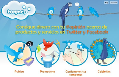 Si disponéis de cien o más seguidores en vuestra cuenta de Twitter y queréis rentabilizar vuestros twitts, os aconsejamos que os registréis en Twync, una empresa que pone en contacto a usuarios de Twitter y Facebook con empresas que quieren difundir sus campañas publicitarias a través de las redes sociales. Se trata de una forma de ganar dinero de lo más sencilla e interesante.
